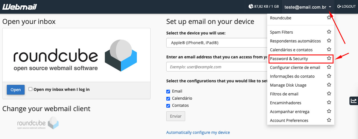 2- Na pagina do Webmail, procure pela opção Password & Security localizada na seta ao lado do seu nome de e-mail (canto superior direito).
