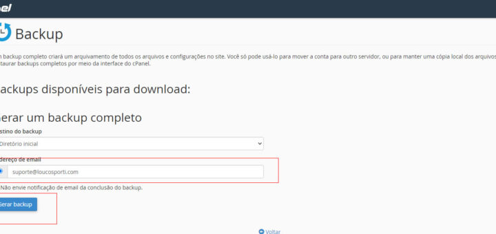 1 – No cPanel, na barra de busca, procure por Backup Em seguida, clique em Backup 2 – Na nova tela, em backup completo, clique em Gerar backup completo 3- Em seguida, preencha...