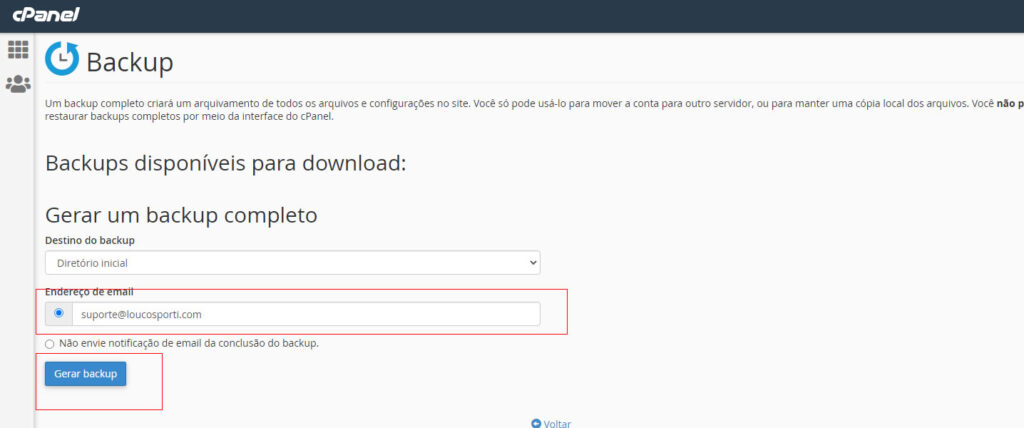 Endereço de e-mail: para ser notificado sobre a conclusão do backup, marque essa opção e informe um e-mail