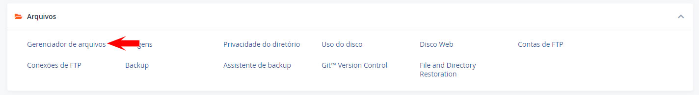 Após fazer login no cPanel da sua conta de hospedagem, procure e clique pela opção “Gerenciador de arquivos” na seção de Arquivos.