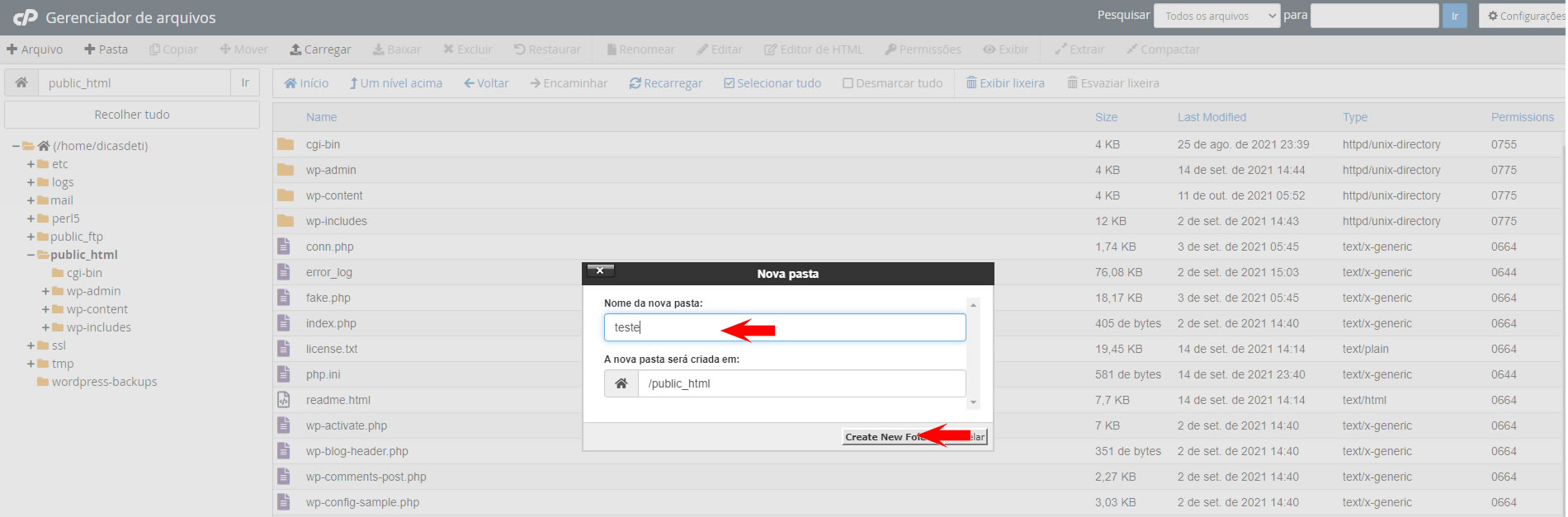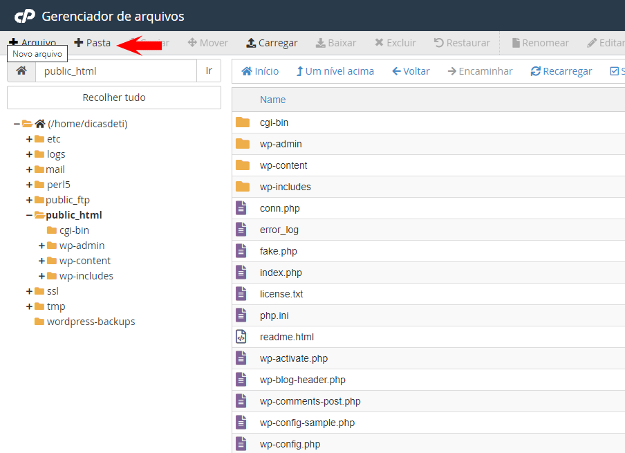 1) Na tela inicial procure pela pasta raiz public_html e em seguida procure e click na opção Pasta.