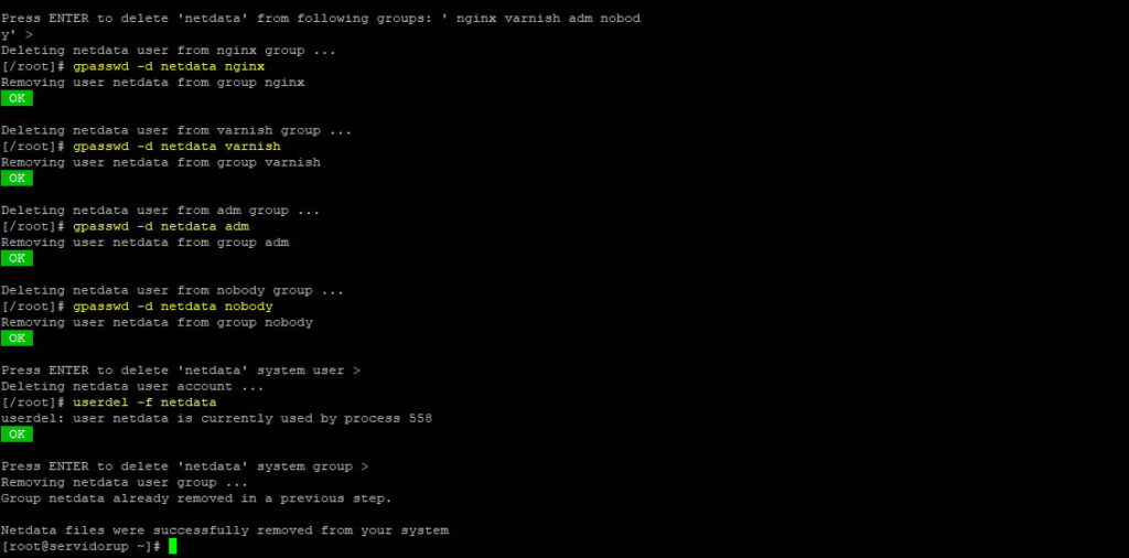02 – Digite /usr/local/src/netdata/packaging/installer/netdata-uninstaller.sh –yes, Aperte Enter pra confirmar remoção do NetData