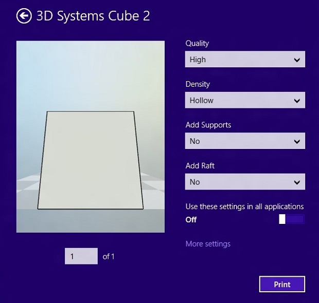 Para o Windows 8.1, havia uma lista de metas a serem alcançadas com este suporte: garantir uma experiência de alta qualidade para apps, tornar mais facil adição de impressão 3D aos seus aplicativos, gerar compatibilidade uniforme entre as impressoras, definir um recurso que ofereça todas as possibilidades e dar suporte a aparelhos que já estão no mercado.